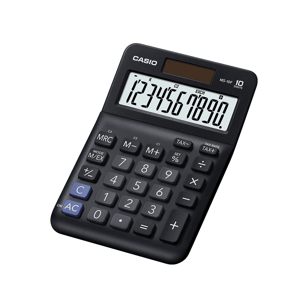 Αριθμομηχανή γραφείου MS-10F της Casio με οθόνη 10 ψηφίων και λειτουργία αποφορολόγησης.
