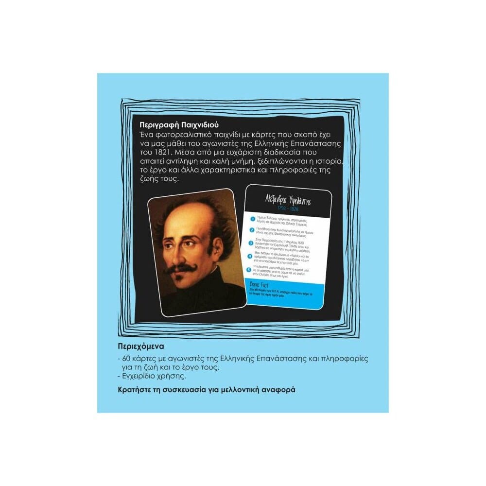 Learning Tube Εκπαιδευτικό Παιχνίδι Ήρωες του 1821Ένα πρωτότυπο παιχνίδι με κάρτες για τη γνώση της ζωής και του έργου των αγωνιστών της Ελληνικής Επανάστασης του 1821! Ένα φωτορεαλιστικό παιχνίδι, χωρίς σκίτσα αλλά με τις πραγματικές φωτογραφίες των ηρώων ώστε να τους μάθουμε όπως πραγματικά υπήρξαν. Το επιτραπέζιο – Ήρωες του 1821 – μπορεί να παιχτεί από 2 ή περισσότερους παίκτες και είναι κατάλληλο για ηλικία από 8 ετών.
