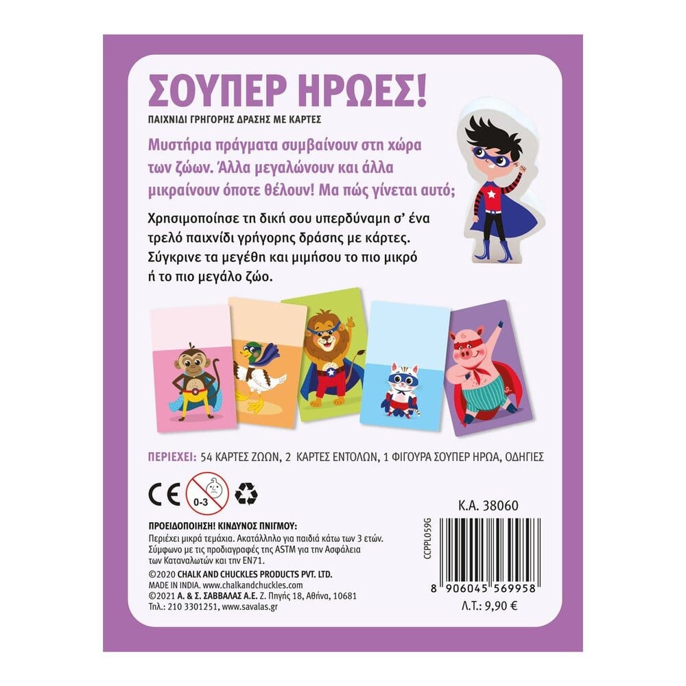 Περιέχει: 54 κάρτες ζώων, 2 κάρτες εντολών, 1 φιγούρα σούπερ ήρωα, οδηγίες.