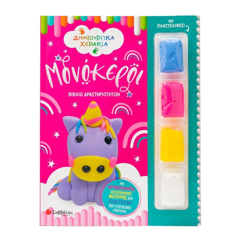 Εξερεύνησε το μαγικό βασίλειο των μονόκερων σ’ αυτό το συναρπαστικό βιβλίο! Δημιούργησε τον δικό σου μοναδικό μονόκερο με πλαστελίνη που στεγνώνει γρήγορα και διασκέδασε με παιχνίδια, ζωγραφική και πολλές άλλες δραστηριότητες.Περιλαμβάνονται 4 πολύχρωμες πλαστελίνες που στεγνώνουν γρήγορα, αποσπώμενες φιγούρες και πάνω από 100 αυτοκόλλητα!