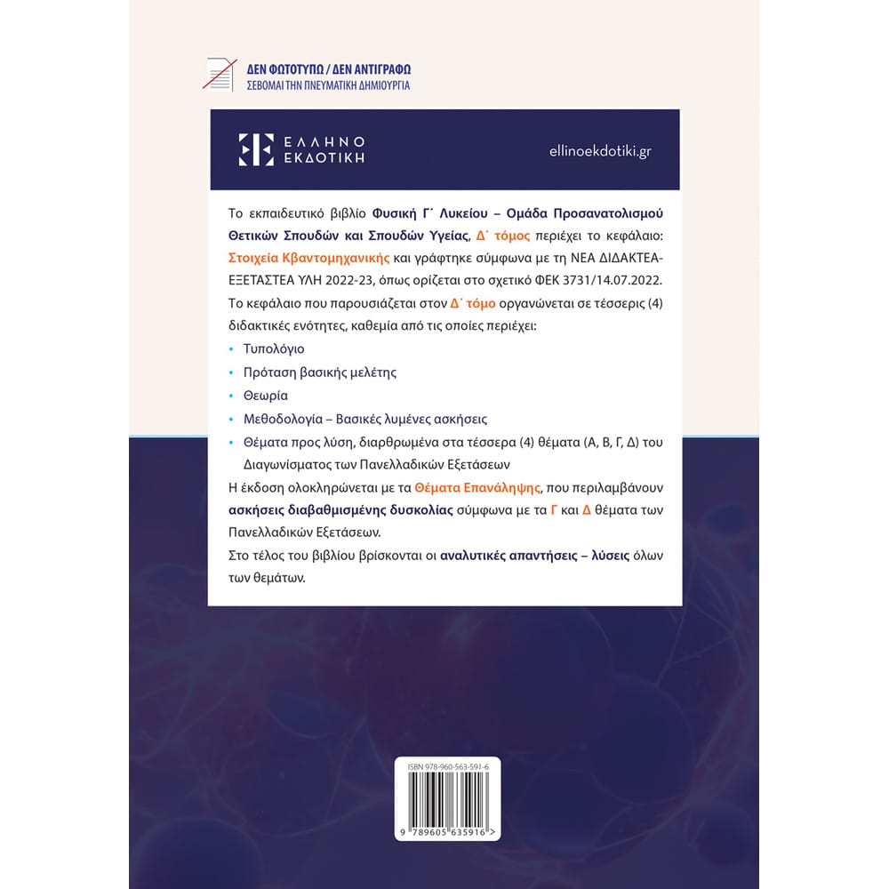 Τo εκπαιδευτικό βιβλίο Φυσική Γ΄ Λυκείου – Ομάδα Προσανατολισμού Θετικών Σπουδών και Σπουδών Υγείας, Δ΄ τόμος περιέχει το κεφάλαιο: Στοιχεία Κβαντομηχανικής και γράφτηκε σύμφωνα με τη ΝΕΑ ΔΙΔΑΚΤΕΑ-ΕΞΕΤΑΣΤΕΑ ΥΛΗ 2022-23, όπως ορίζεται στο σχετικό ΦΕΚ 3731/14.07.2022.Το κεφάλαιο που παρουσιάζεται στον Δ΄ τόμο οργανώνεται σε τέσσερις (4) διδακτικές ενότητες, καθεμία από τις οποίες περιέχει:• Τυπολόγιο• Πρόταση βασικής μελέτης• Θεωρία• Μεθοδολογία – Βασικές λυμένες ασκήσεις• Θέματα προς λύση, διαρθρωμένα στα τέσσερα (4) θέματα (Α, Β, Γ, Δ) του Διαγωνίσματος των Πανελλαδικών ΕξετάσεωνΗ έκδοση ολοκληρώνεται με τα Θέματα Επανάληψης, που περιλαμβάνουν ασκήσεις διαβαθμισμένης δυσκολίας σύμφωνα με τα Γ και Δ θέματα των Πανελλαδικών Εξετάσεων.Στο τέλος του βιβλίου βρίσκονται οι αναλυτικές απαντήσεις – λύσεις όλων των θεμάτων.