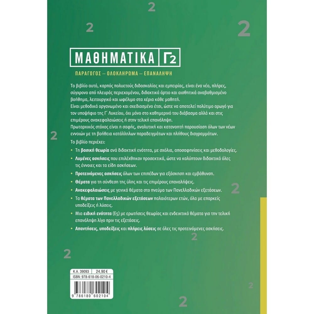 Το βιβλίο αυτό, καρπός πολυετούς διδασκαλίας και εμπειρίας, είναι ένα νέο, πλήρες, σύγχρονο από πλευράς περιεχομένου, διδακτικά άρτιο και αισθητικά αναβαθμισμένο βοήθημα, λειτουργικό και ωφέλιμο στα χέρια κάθε μαθητή. Είναι μεθοδικά οργανωμένο και σχεδιασμένο έτσι, ώστε να αποτελεί πολύτιμο αρωγό για τον υποψήφιο της Γ΄ Λυκείου, όχι μόνο στο καθημερινό του διάβασμα αλλά και στις επιμέρους ανακεφαλαιώσεις ή στην τελική επανάληψη. Πρωταρχικός στόχος είναι η σαφής, αναλυτική και κατανοητή παρουσίαση όλων των νέων εννοιών με τη βοήθεια κατάλληλων παραδειγμάτων και πλήθους διαγραμμάτων.Το βιβλίο περιέχει:• Τη βασική θεωρία ανά διδακτική ενότητα, με σχόλια, αποσαφηνίσεις και μεθοδολογίες.• Λυμένες ασκήσεις που επιλέχθηκαν προσεκτικά, ώστε να καλύπτουν διδακτικά όλες τις έννοιες και τα είδη ασκήσεων.• Προτεινόμενες ασκήσεις όλων των επιπέδων για εξάσκηση και εμβάθυνση.• Θέματα για τη σύνθεση της ύλης και τις επιμέρους επαναλήψεις.• Ανακεφαλαιώσεις με γενικά θέματα στο πνεύμα των Πανελλαδικών εξετάσεων.• Τα θέματα των Πανελλαδικών εξετάσεων παλαιότερων ετών, όλα με επαρκείς υποδείξεις ή λύσεις.• Μια ειδική ενότητα (Ε5) με ερωτήσεις θεωρίας και ενδεικτικά θέματα για την τελική επανάληψη λίγο πριν τις εξετάσεις.• Απαντήσεις, υποδείξεις και πλήρεις λύσεις σε όλες τις προτεινόμενες ασκήσεις.