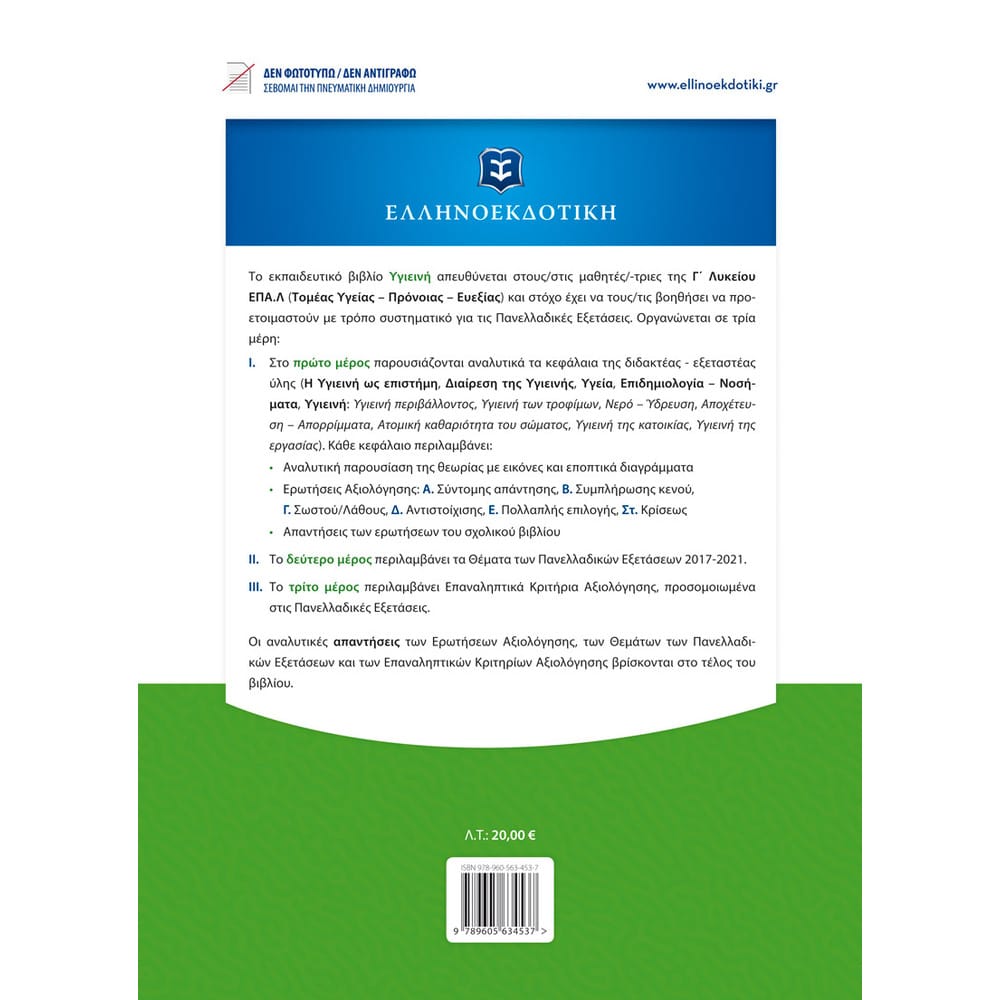 εκπαιδευτικό βιβλίο Υγιεινή απευθύνεται στους/στις μαθητές/-τριες της Γ΄ Λυκείου ΕΠΑ.Λ (Τομέας Υγείας – Πρόνοιας – Ευεξίας) και στόχο έχει να τους/τις βοηθήσει να προετοιμαστούν με τρόπο συστηματικό για τις Πανελλαδικές Εξετάσεις. Οργανώνεται σε τρία μέρη:Ι.  Στο πρώτο