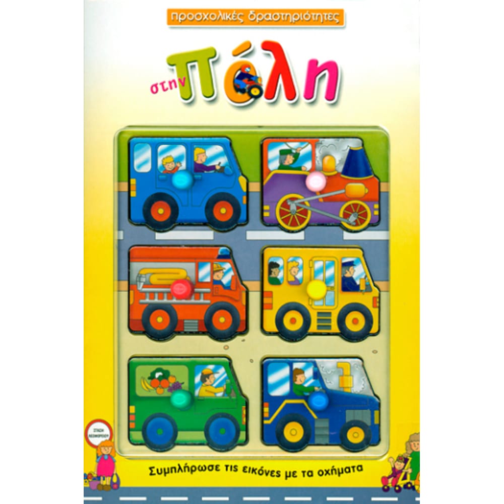 Στις Προσχολικές δραστηριότητες στην πόλη, οι φίλοι μας ακολουθούν τον μικρό Πέτρο και τον πατέρα του σε μια βόλτα με το αυτοκίνητο στην πόλη. Ενώ περνούν από διάφορες περιοχές, συναντούν ανθρώπους και ζώα, οχήματα και μαγαζιά. Σε κάθε σελίδα υπάρχει και μια ερώτηση που μπορεί να απαντηθεί αν δώσουμε λίγη προσοχή στην ιστορία. Μια σειρά από αυτοκινητάκια, τρενάκια, μεγάλα οχήματα και φορτηγά βρίσκονται στο εξώφυλλο και αποσπώνται εύκολα, ενώ προσαρμόζονται σε κάθε σελίδα σε ειδικές θέσεις ζωντανεύοντας την ιστορία. Το παιχνίδι αρχίζει ανά πάσα στιγμή, ενώ τα παιδιά γνωρίζουν τα οχήματα, καθώς αποκτούν οδική αγωγή και κάνουν την πρώτη τους επαφή με τους αριθμούς.